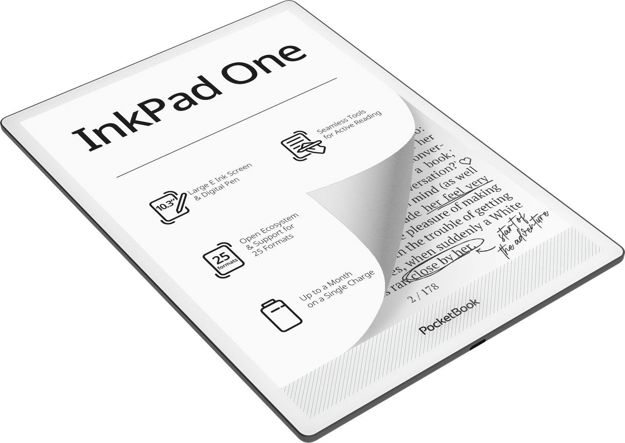 PocketBook presenta InkPad One, un nuovo e-reader da 10,3” con stilo, progettato per la lettura attiva e una scrittura manuale confortevole. Il dispositivo è dotato di un display E Ink Mobius™ dall’aspetto cartaceo e include una penna digitale per prendere appunti in modo naturale, offrendo una gamma di strumenti di scrittura integrati. InkPad One è una soluzione a grande schermo conveniente per leggere, scrivere e gestire le attività quotidiane.